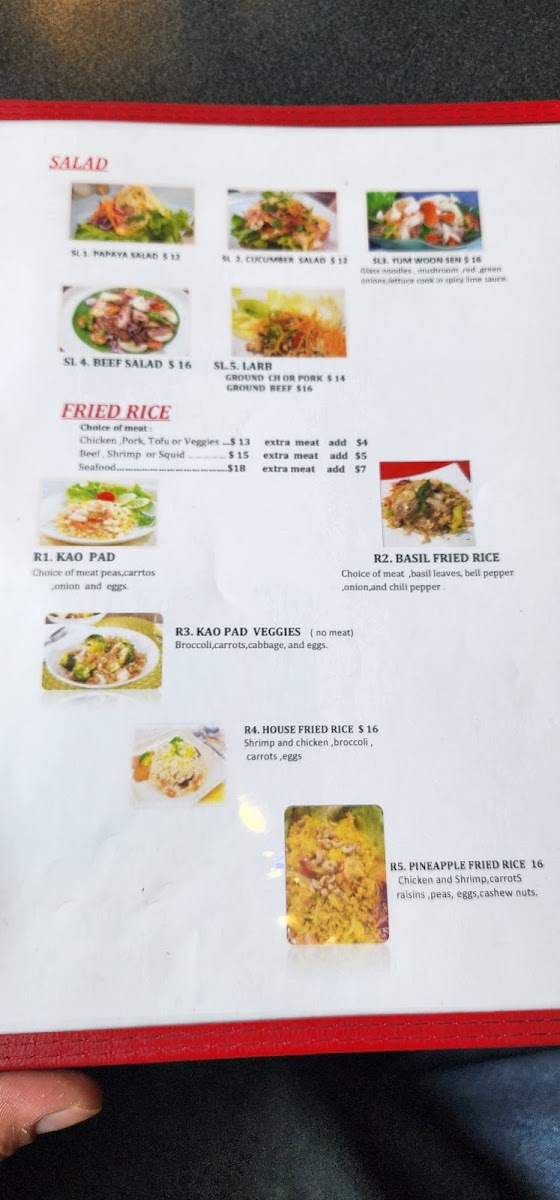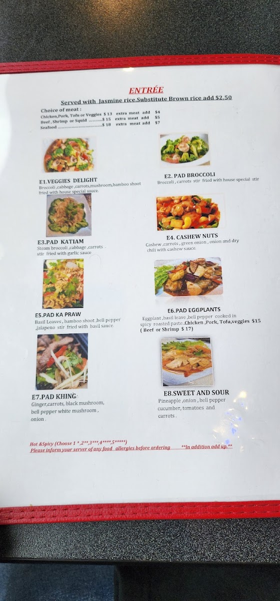 Spicy. Choice of meat with basil leaves, bell pepper, onion, and chili pepper. Add seafood, shrimp, veggies, tofu, pork, chicken for an additional charge.